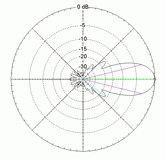 Horizontal pattern of the 12-Element-28-Ohm-Yagi at 144,3 MHz You can earn a box with 20 bottles of good German beer if you reach that aim to construct any comparable 50-Ohm-Yagi with 8m-boom, 14,28dBd gain, 2MHz bandwidth and such a clean pattern! |