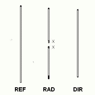 The highest current is in the radiator, from the center the currents in the wave structure of the yagi are falling to the end slightly. If you have elements with lower currents in the structure, there is a failure in the contruction! This is the case for many older designs and the reason for bad patterns. Now we try to change the design to an impedance of 50 Ohm. Therefore we need an additional "match-element" very close to the radiator. This element is not working as a classic director, it is an "open-sleeve-element", which has now the highest current in the yagi system. We have replaced the one radiator (2) by two new elements ( 2 and 3). This system is very critical for the impedance trend and the pattern of the yagi. Why do that? My conclusion is the 28-Ohm-principle. All high-gain-long yagis with 50Ohm-impedance have a significant lower bandwidth with slighly less or equal gain in comparison with the 28-Ohm-Yagis. |