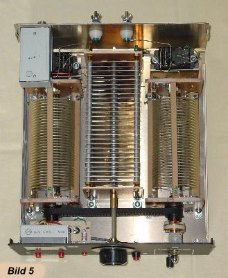 Die Relais zum Umschalten der Kapazitäten befinden sich im hinteren Teil des Tuners. Direkt an der Antennenbuchse sitzt in einem abgeschirmten Gehäuse die SWR-Schaltung. Eine separate Platine an der Frontseite trägt die Schalter und Bauteile für die Leistungsumschaltung und die Relais- steuerung.Die Innenansicht (Bild 4) zeigt die beschriebenen Bauteile. Die Frontplatte (Bild 1) trägt rechts den Kurbelknopf für die Rollspulen, darüber das mechanische Zählwerk, und in der Mitte den Drehknopf mit Feintrieb für den Drehko. Nur zwei Abstimmelemente machen einen Frequenzwechsel sehr schnell möglich, vor allem wenn man sich in einer Tabelle die Bandabstimmpunkte notiert hat. Unten sind vier Druckschalter für die Skalenbeleuchtung (An/Aus), die Leistungsanzeige (300/3000Watt), den Parallel-Kondensator zum Ver- größern des Drehko-Bereichs und die Relaisbetätigung Hi-Z/Lo-Z ange- ordnet. An