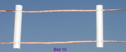 Zum Abschluss soll noch eine selbstgebaute, hoch belastbare, aber sehr leichte Feederleitung gezeigt werden. Dazu wird ein PVC-Installationsrohr in 8cm lange Stücke gesägt. Jeweils 1cm von jedem Ende wird ein Loch gebohrt, durch das die beiden Leitungen gefädelt werden. Damit liegen die beiden Drähte 6cm auseinander. Der Abstand der Spreizer kann 30-40cm betragen. Dann wird mit einem Stück 1mm-Cu-Draht rund um jede Leitung bei jedem Spreizer verschiebungssicher eine Befestigung gelötet. |