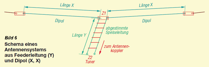 Die Speiseleitung wurde direkt an den Schwingkreis der mit Röhren bestückten Endstufe angekoppelt. Die ursprünglich verwendeten Längen und Verhältnisse von Dipol und Speiseleitung kann man sich mit Bild 6 vor Augen führen. Sind die Abschnitte X so bemessen, dass sie einer Viertelwellenlänge oder ungeradzahligen Vielfachen davon entsprechen, so ist der Impedanzpunkt Z1 niederohmig mit einem Strombauch und einem Spannungsknoten. Genau umgekehrt sind die Verhältnisse bei Längen von X, die einer Halbwelle oder Vielfachen davon entsprechen. Bei Z1 liegt dann ein hochohmiger Impedanzpunkt mit Spannungsbauch und Stromknoten vor. Hat