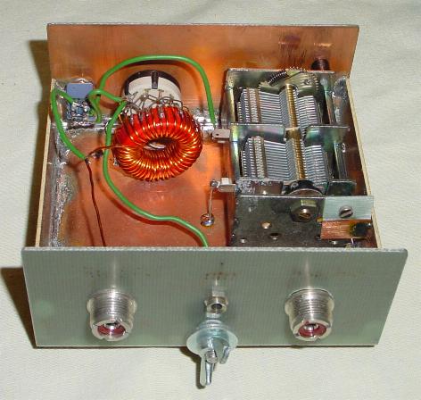 Also nehmen wir eine angezapfte Ringkernspule, die zusammen mit einem 12-poligen Schalter (S1) den Zweck genauso gut erfüllt. Bei geschickter Wahl der Anzapfpunkte haben wir zusammen mit dem Drehko genug Spielraum mit den Variationsmöglichkeiten. Zusammen mit zwei Koaxbuchsen werden L und C in ein metallisches Gehäuse eingebaut. Der Schalter S2 ist nicht unbedingt nötig, man kann bei den oben beschriebenen Fällen, wo eine LC-Anpassung nicht möglich ist, Ein- und Ausgang manuell durch Umstecken vertauschen. Für schnellen Bandwechsel ist dies aber keine gute Lösung. Befindet sich S2 in der rechten (gezeichneten) Position, so haben wir die "High-Z"-Schaltung für Impedanzen >50Ohm. Dieser Fall trifft für Drahtlängen über Lambda/Viertel zu. In der linken Position befindet sich der Drehko am Eingang des Tuners. Jetzt haben wir die "Low-Z"-Anordnung für Drähte <50Ohm, also kürzer als eine Viertelwellenlänge (z.B. Mobilstrahler). Aus Abb. 2 geht die gesamte Verdrahtung hervor, auf dem Foto (Abb. 3) sieht man die Lage der Bauelemente. An der Rückseite sollte man eine Schraube mit Flügelmutter und eine blanke Bananenbuchse vorsehen. Dort, und nicht am Transceiver (!), wird die Masse angeklemmt. |
