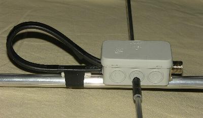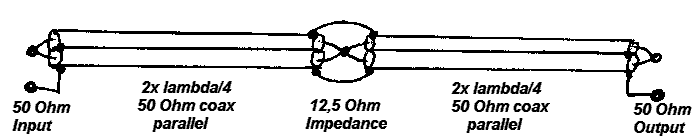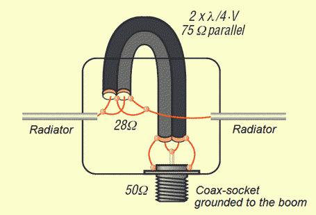 The basic principle is a quarter-wave line of two coax-cables in parallel. One end of the line ist connected to the radiator, the other to a socket, which is grounded at the metallic boom and has two functions: 1. It transforms the resistance of the radiator to the 50Ohm of the feeding line. With 2x75-Ohm-cables 28 to 50 Ohm. With 2x50-Ohm-cables 12.5 to 50 Ohm. With 3x93-Ohm-cables 18 to 50 Ohm 2. This line is a simplified coaxial sleeve balun to avoid sleeve-waves on the braid of the cable running to the station. Very effective! |