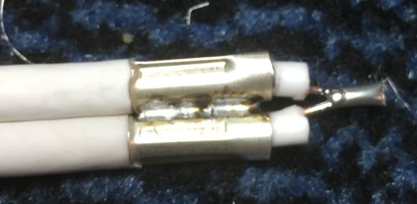 Here two cables RG58 (50 Ohm) and RG6 (75 Ohm) in parallel. The two cables have different diameters, but the same VF of 0,67. The 70-MHz-Yagi has a perfect match from 18 to 50 Ohm. |